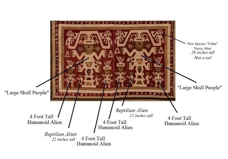 The "Feline" Nazca Alien was represented by the "Cat Like" symbol, and apears as a cat in over 30 textiles from that time period.